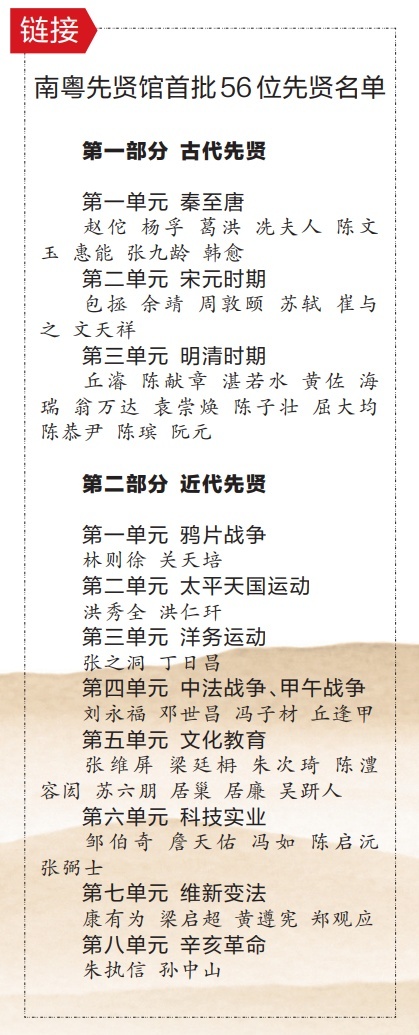 首批载入史册的56位南粤先贤中,按照籍贯来划分,有11位不是广东籍,45位出生于本土;按照时间划分,有26位古代先贤、30位近代先贤,近代先贤略多于古代。11位外地南粤先贤中,有8位是古代先贤,可见古代岭南,外地文人士大夫对于广东的影响是巨大的。30位近代先贤中只有3位是南下官员,岭南文化到了近代已经日臻成熟,从先贤占比可窥一斑。
